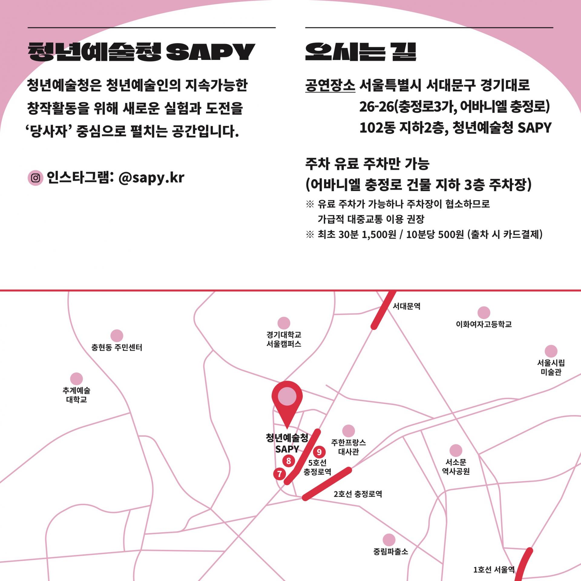 · 주소: 서울시 서대문구 경기대로 26-26 어바니엘 충정로 지하 2층 청년예술청